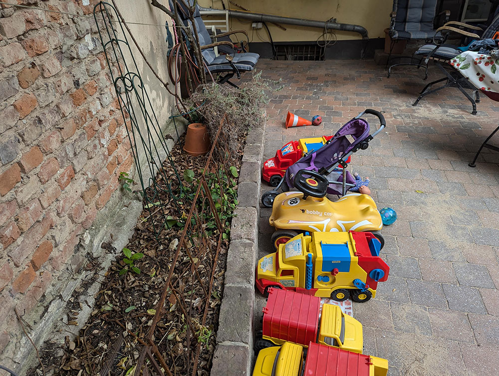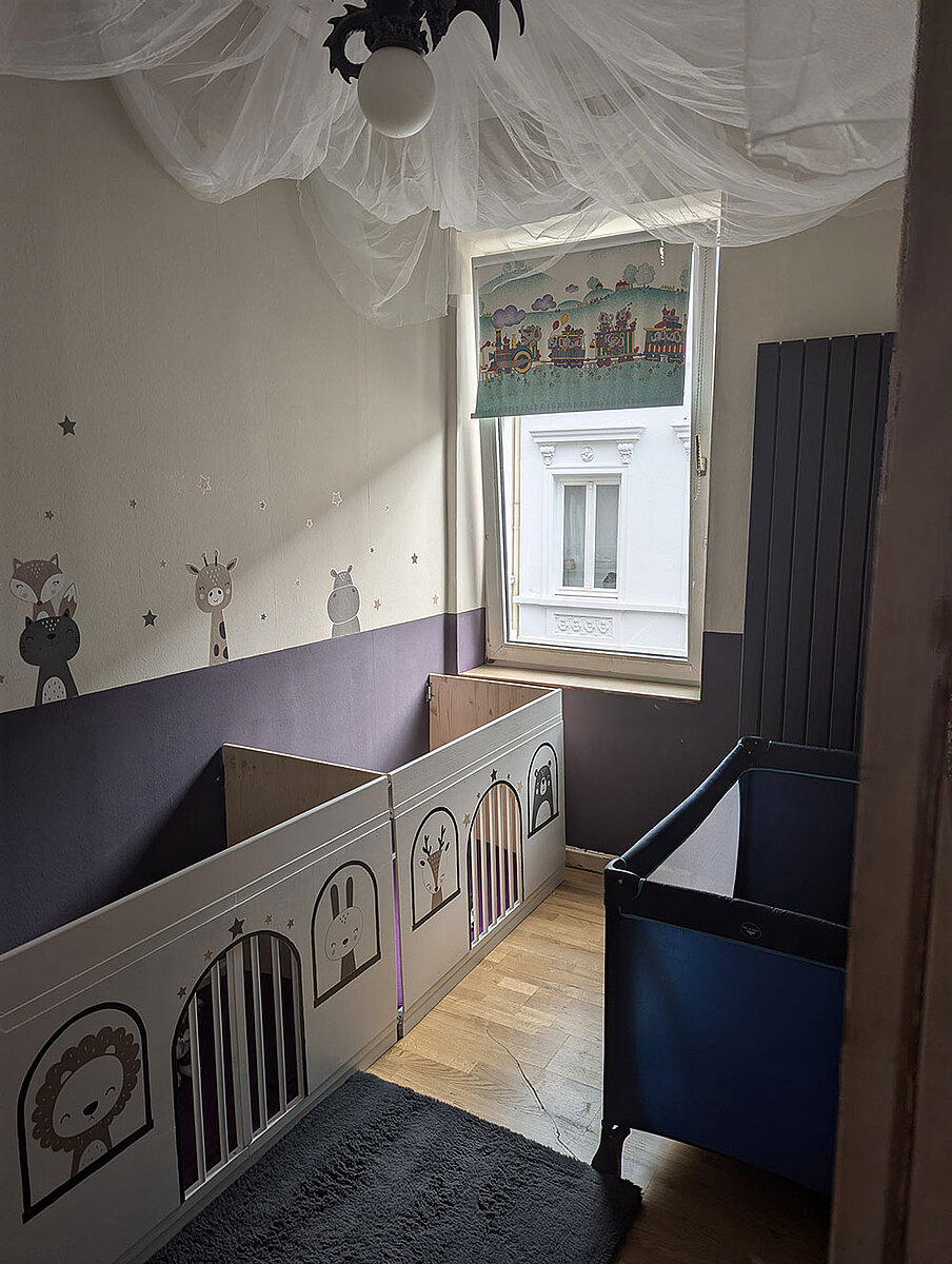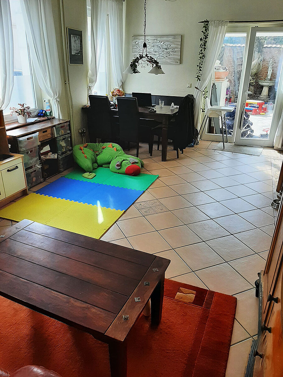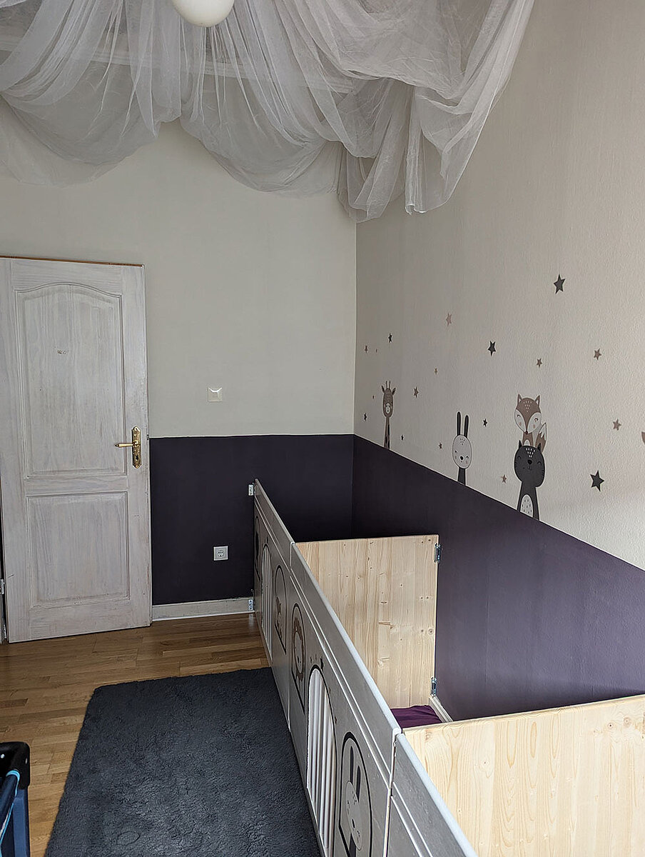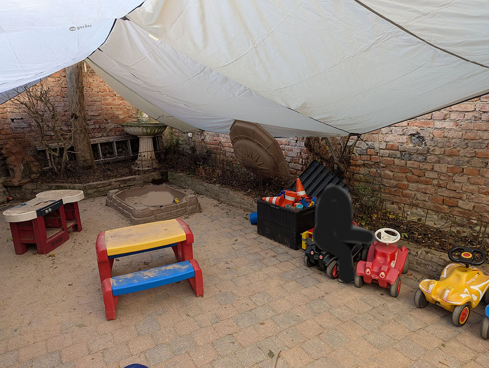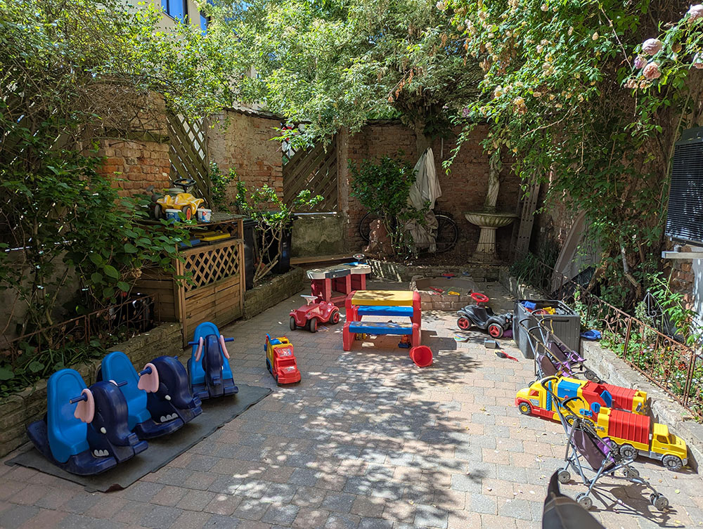 Die Betreuung findet in privaten Räumlichkeiten im Erdgeschoss und Hofbereich eines sanierten Altbaus statt. Der überdachbare Außenbereich lädt bei jedem Wetter zum Spielen und Toben ein.