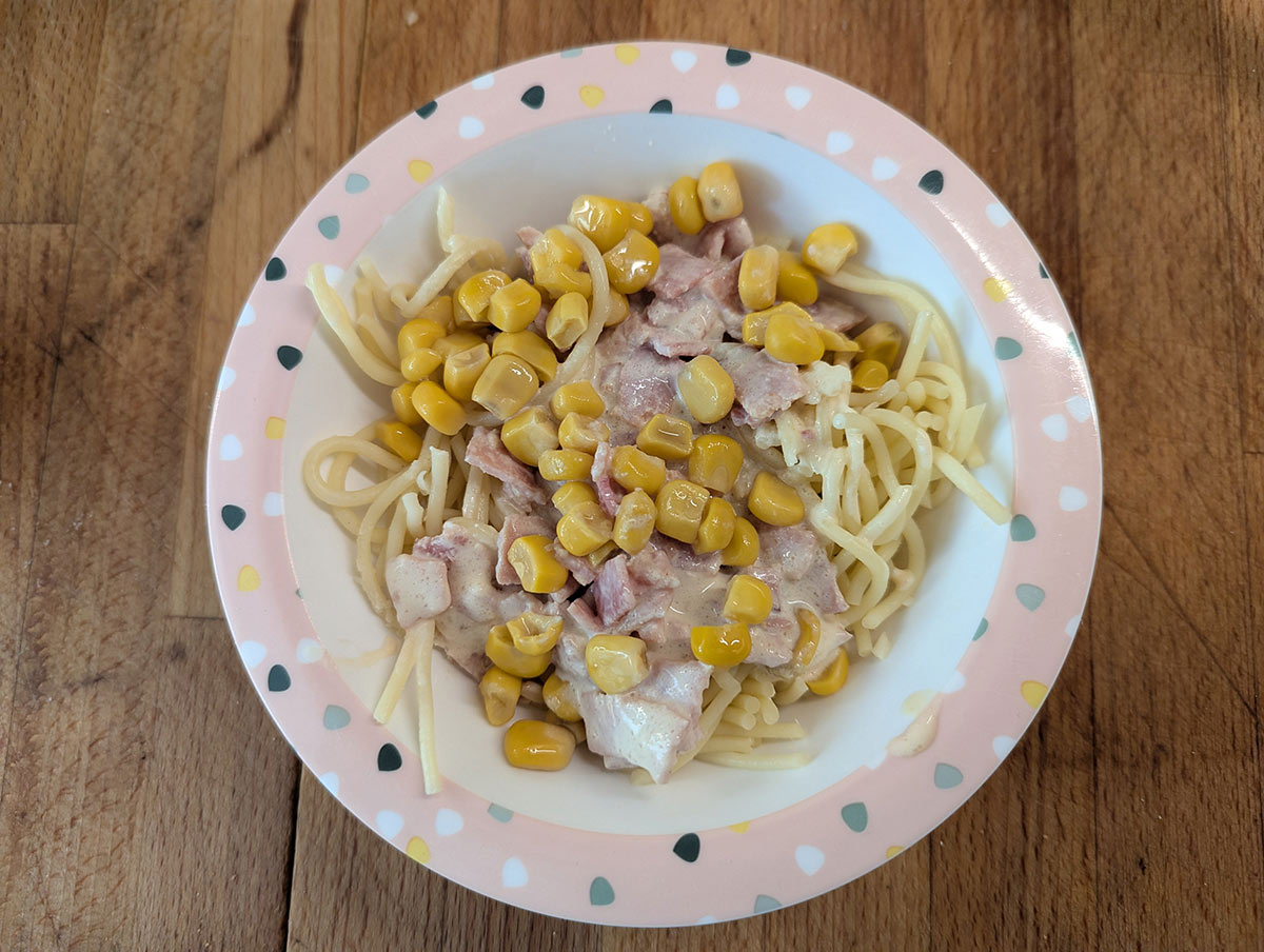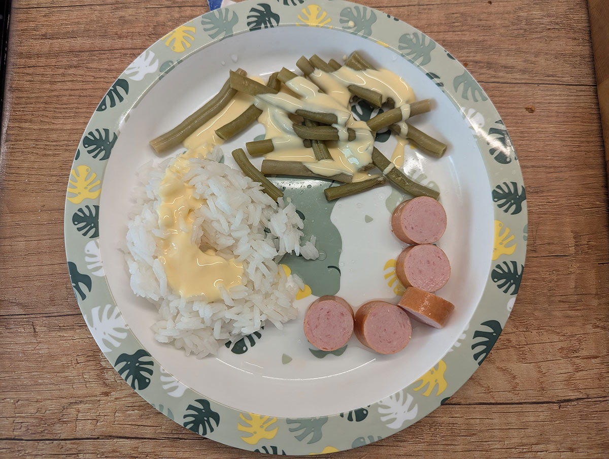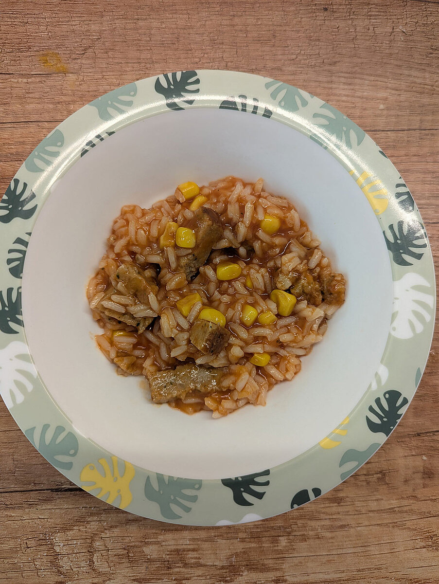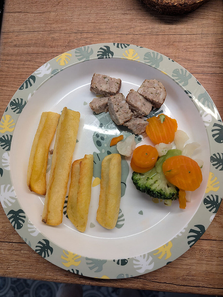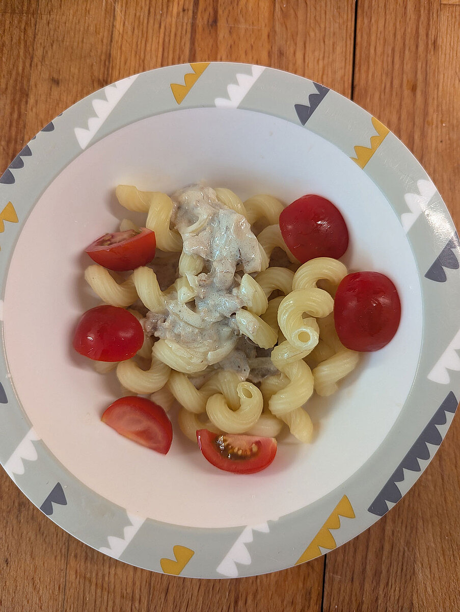 - Mittagessen (aus frischen Zutaten selbst zubereitet, gelegentlich Pizza oder Fischstäbchen)