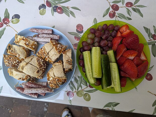 Mittagessen (aus frischen Zutaten selbst zubereitet, gelegentlich Pizza oder Fischstäbchen)